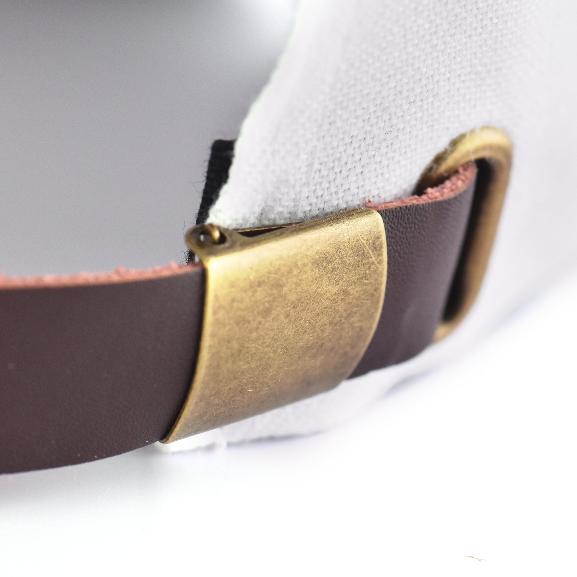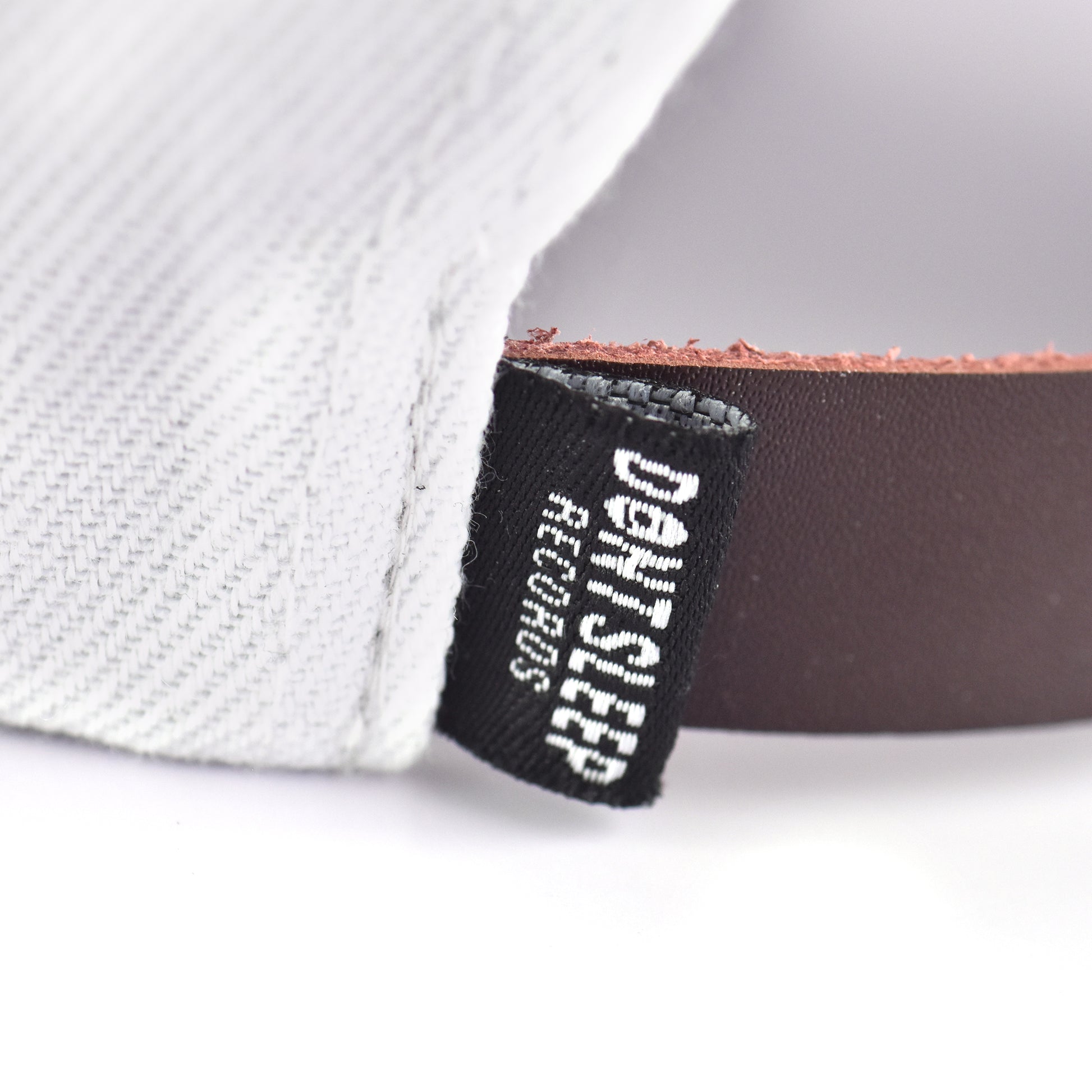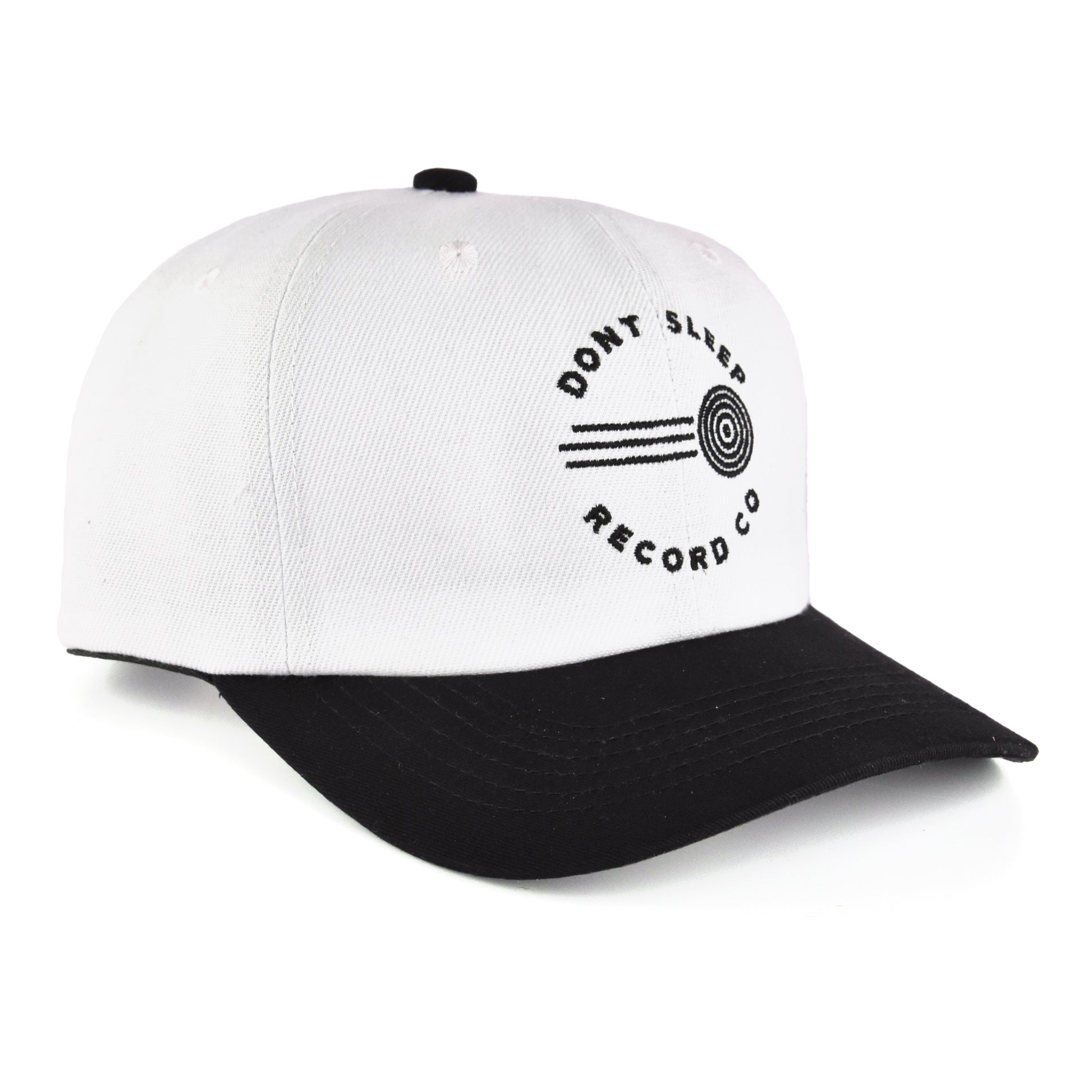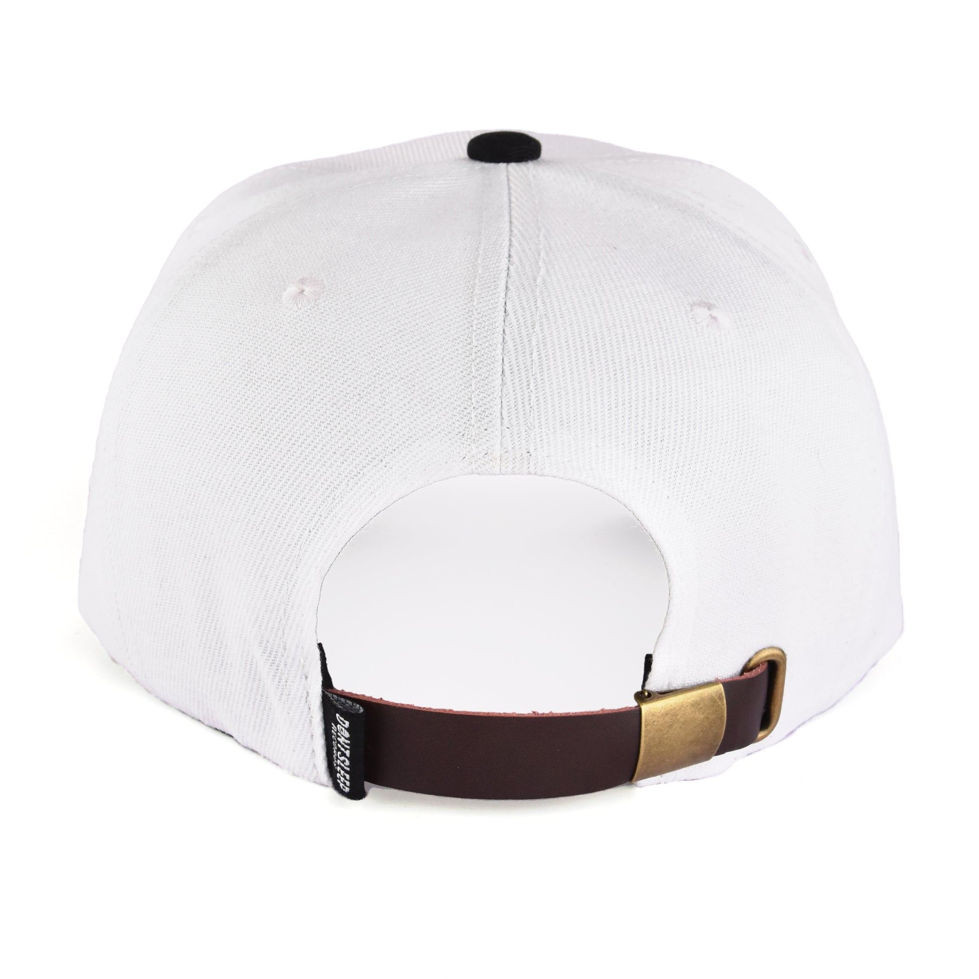 Custom stitched 6 panel strap back hat with brass clasp, embroidered logo on front, woven label on back of cap and custom Don't Sleep in-seam tape.